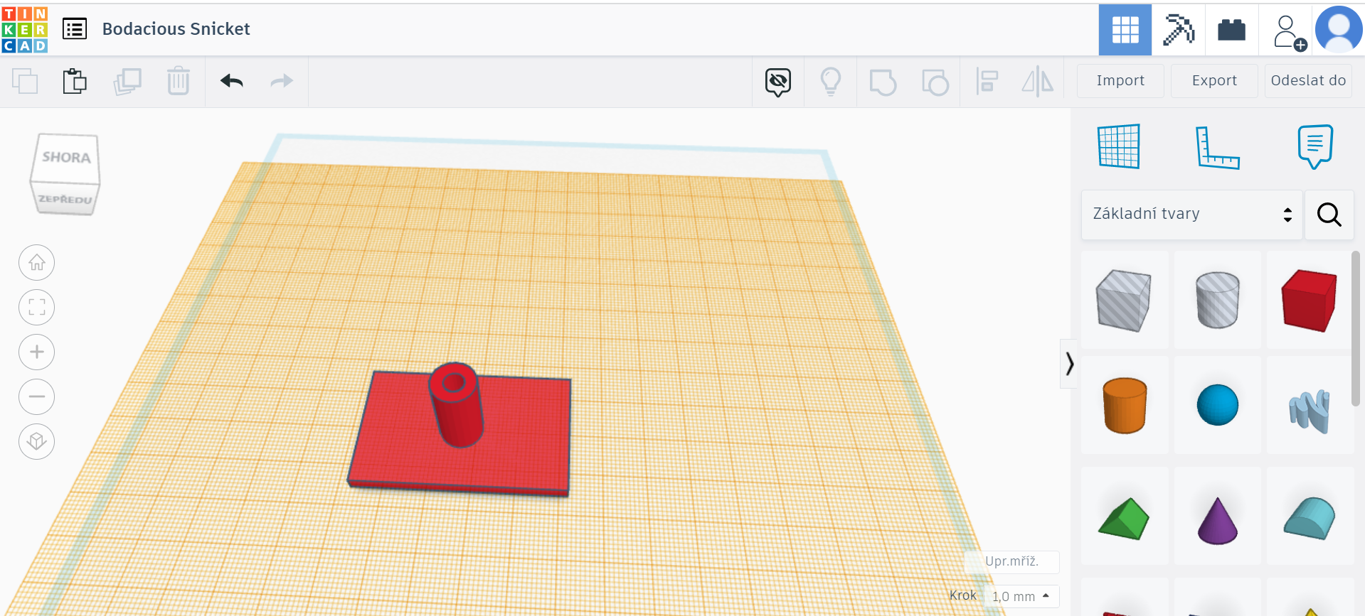 - Online program TinkerCad. Z bočního panelu, ve kterém máme možnost využít různých tvarů, si každý zvolí krychli